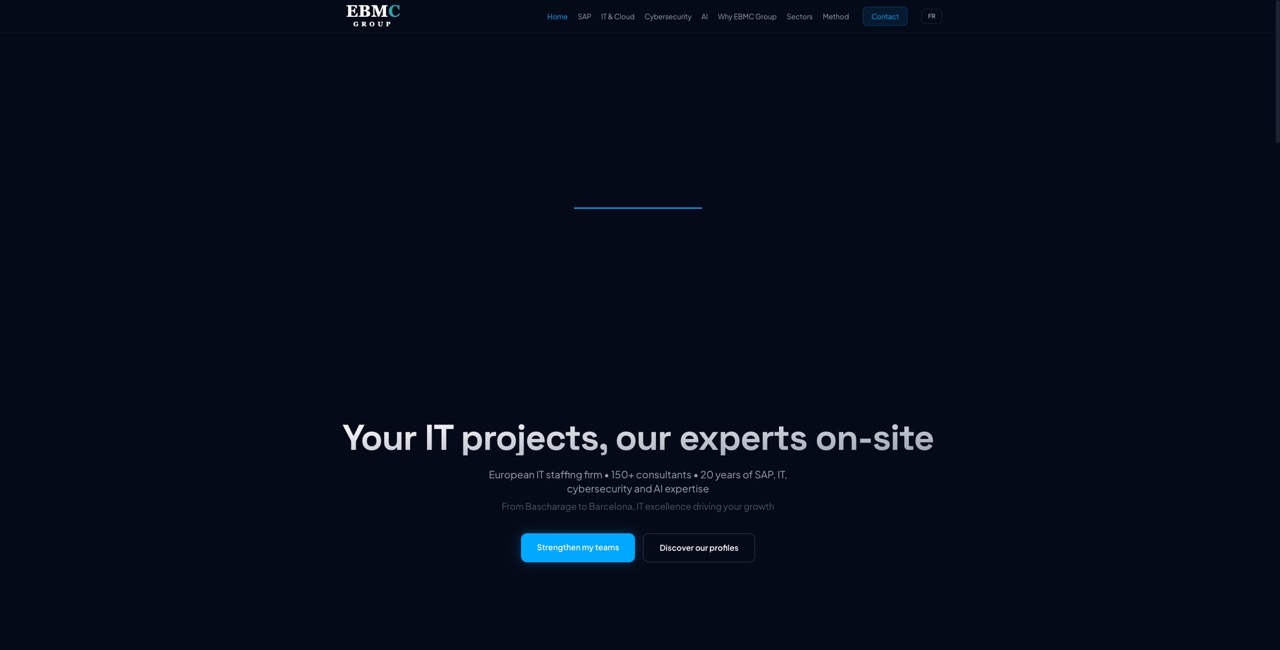 Premium bilingual corporate website for EBMC Group (Luxembourg), a merger of LMGC and EBMC founded in 2005. Features animated bento grids, Aceternity-style components, sparkle particles, custom animated SVG icons, sticky scroll reveals, and full SEO with JSON-LD. Covers SAP consulting, IT & Cloud, Cybersecurity, and AI services. Includes internal CRM with 22,000+ CVs connected to AWS RDS.