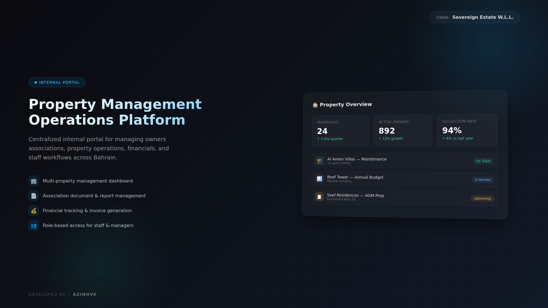 Internal operations portal for Sovereign Estate W.L.L., centralizing property management workflows, financial tracking, maintenance requests, and staff coordination across all managed owners associations in Bahrain.