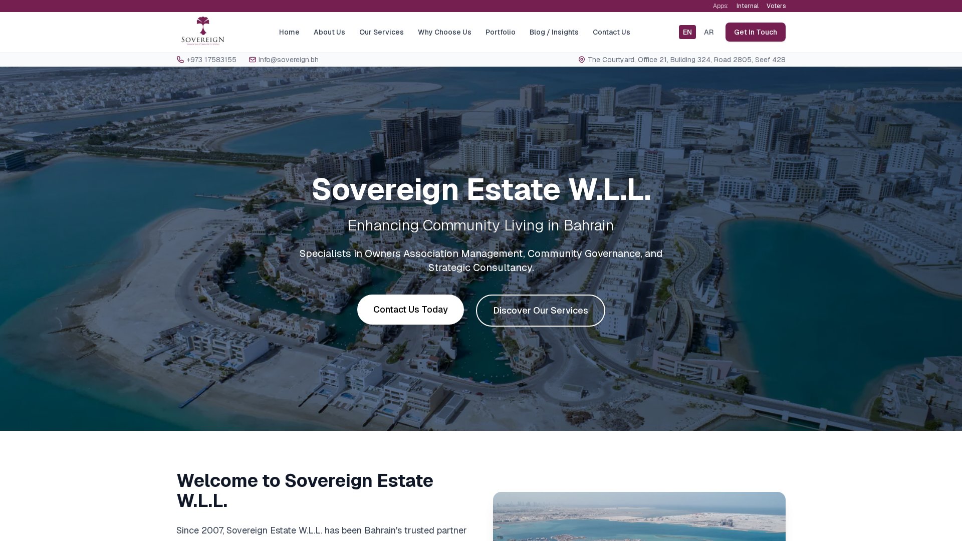 This project represents a comprehensive web solution designed to meet modern business needs. Built with state-of-the-art technologies and following best practices in web development, it delivers exceptional performance and user experience. Additional details: Sovereign Estate W.L.L. was founded with a mission to transform how communities are governed, managed, and sustained in Bahrain. With roots in Body Corporate Services (BCS), Australia, we bring global expertise refined for Bahrain's evolving property market.